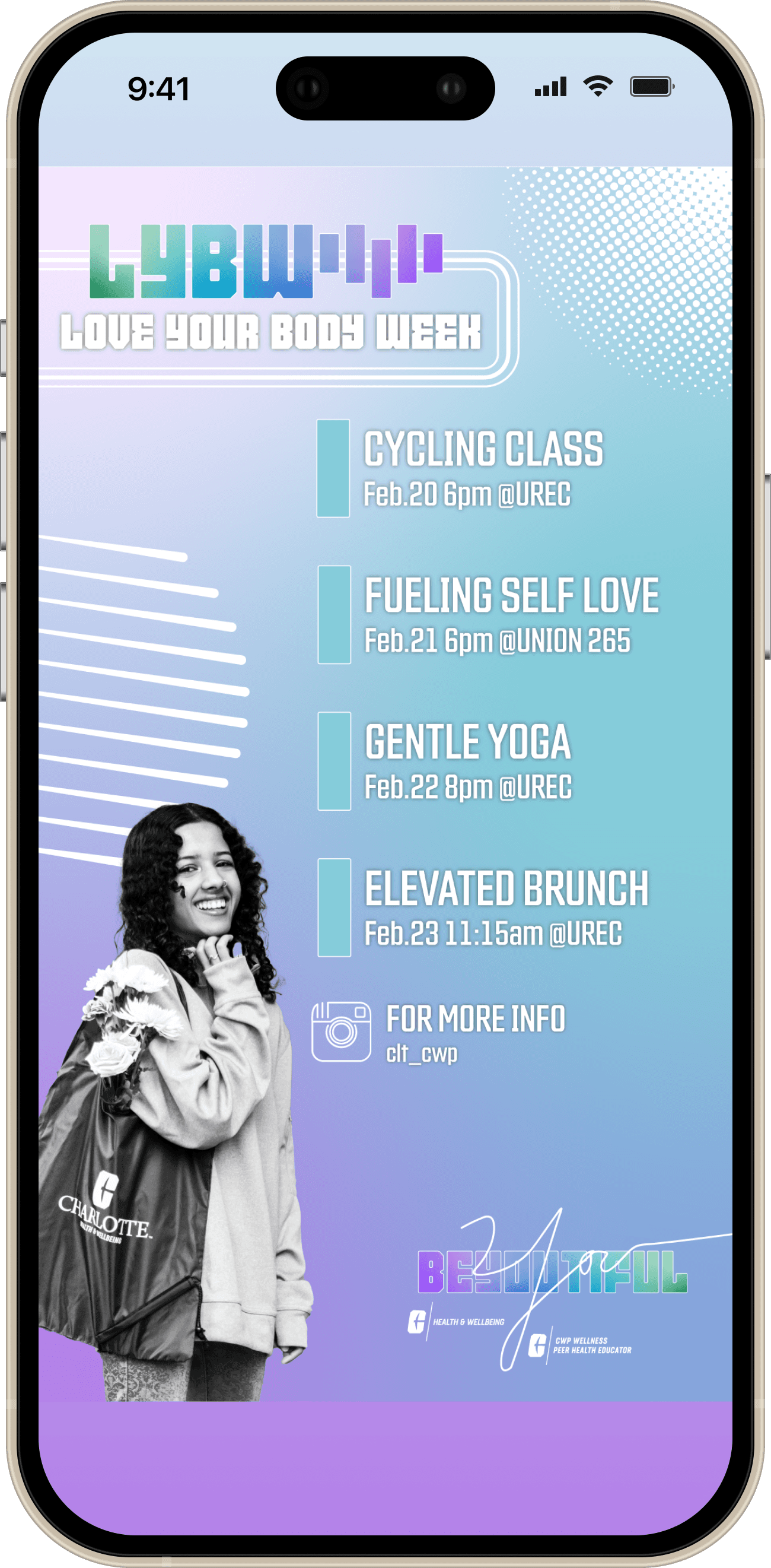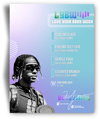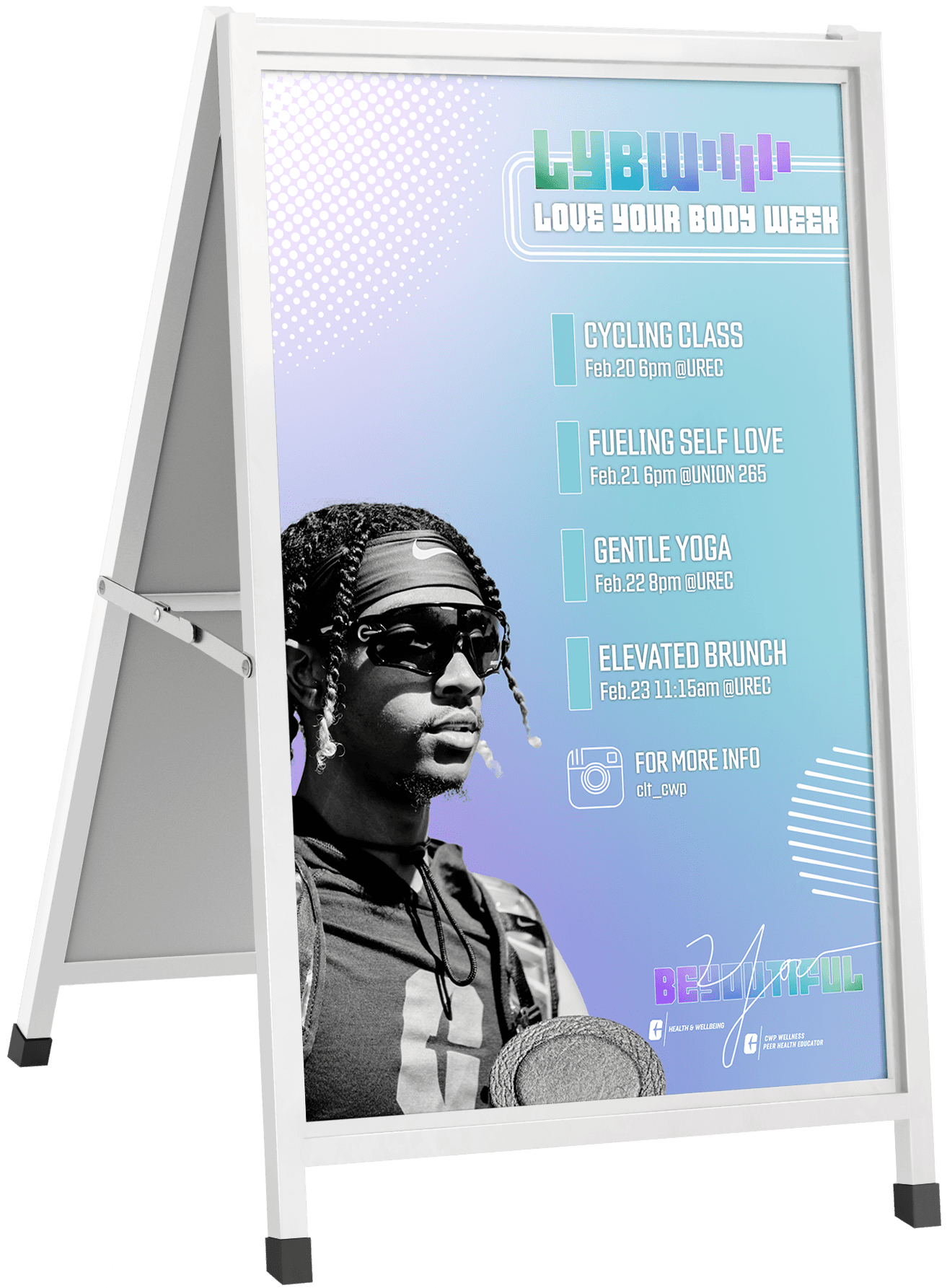 Although initial concepts explored iconography, the campaign transitioned to emphasizing the human body. Greater attention was devoted to layout design, surpassing the priorities of Healthy Campus Week. This initiative required both digital and print materials, presenting the challenge of maintaining cohesion and consistency across varied scales and formats. The use of reusable assets ensured visual unity throughout all deliverables.